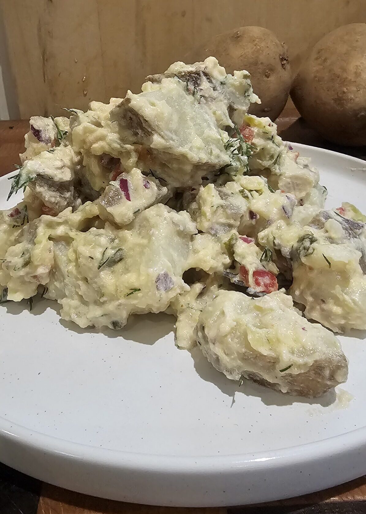 So I started experimenting. I swapped that traditional mayo for homemade cashew mayo. I added pimentos for brightness, dill for freshness, and just enough mustard to give it a little wake-up call. The result? A potato salad I actually look forward to — one that’s tangy, creamy, fresh, and familiar all at once.
